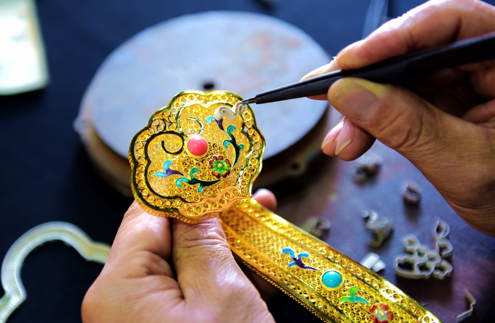 清朝时期,清宫内务部还设立了“花丝造办处”,专门负责为八旗贵族服务。花丝镶嵌的工艺极其复杂,以编织、堆垒技法见长,常搭配点翠等工艺,呈现金碧辉煌的效果,所以后来,人们把它和牙雕、景泰蓝、京绣等工艺并称为“燕京八绝”。